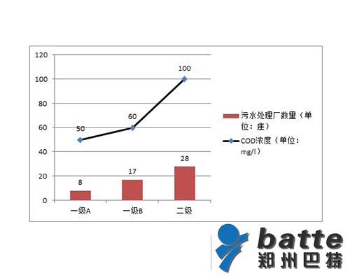 按照國家標準,污水處理廠污染物排放標準由高到低分為一級A、一級B和二級三類,尾水中的COD濃度限值從50mg/l、60mg/l到100mg/l依次升高。而上海現有污水處理廠的排放標準總體等級偏低,8成污水處理量只達到二級標準。