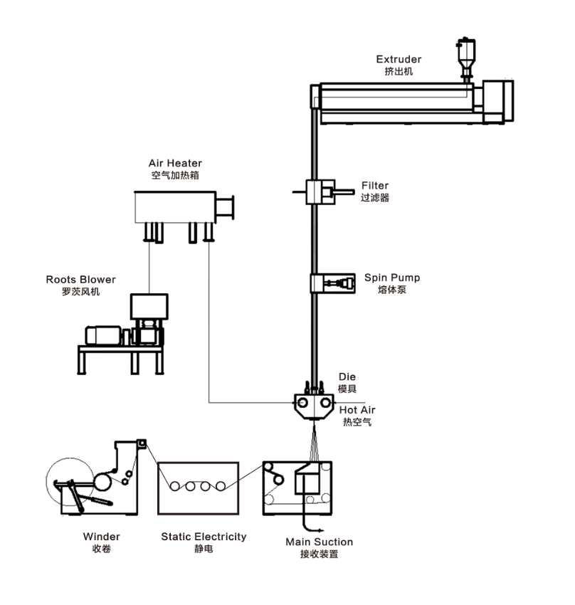 采用熔噴法工藝生產熔噴布,其設備主要包括:螺桿擠出機、熔噴布計量泵、熔噴換網過濾器、熔噴裝置、卷繞裝置機、空氣系統(熱風機與加熱器)等。螺桿擠壓機作用是:將切片物料熔化;熔噴布計量泵其作用是:精準計量,控制產量和纖維的細度,將熔體連續均勻輸送到噴絲頭。熔噴換網器其作用是:將熔體中的雜質過濾掉,以免堵塞噴絲孔。卷繞裝置機的作用是:將熔噴布成卷包裝??諝庀到y(熱風機與加熱器)的作用是:提供紡絲氣流拉伸時所用的熱空氣的溫度與壓力。